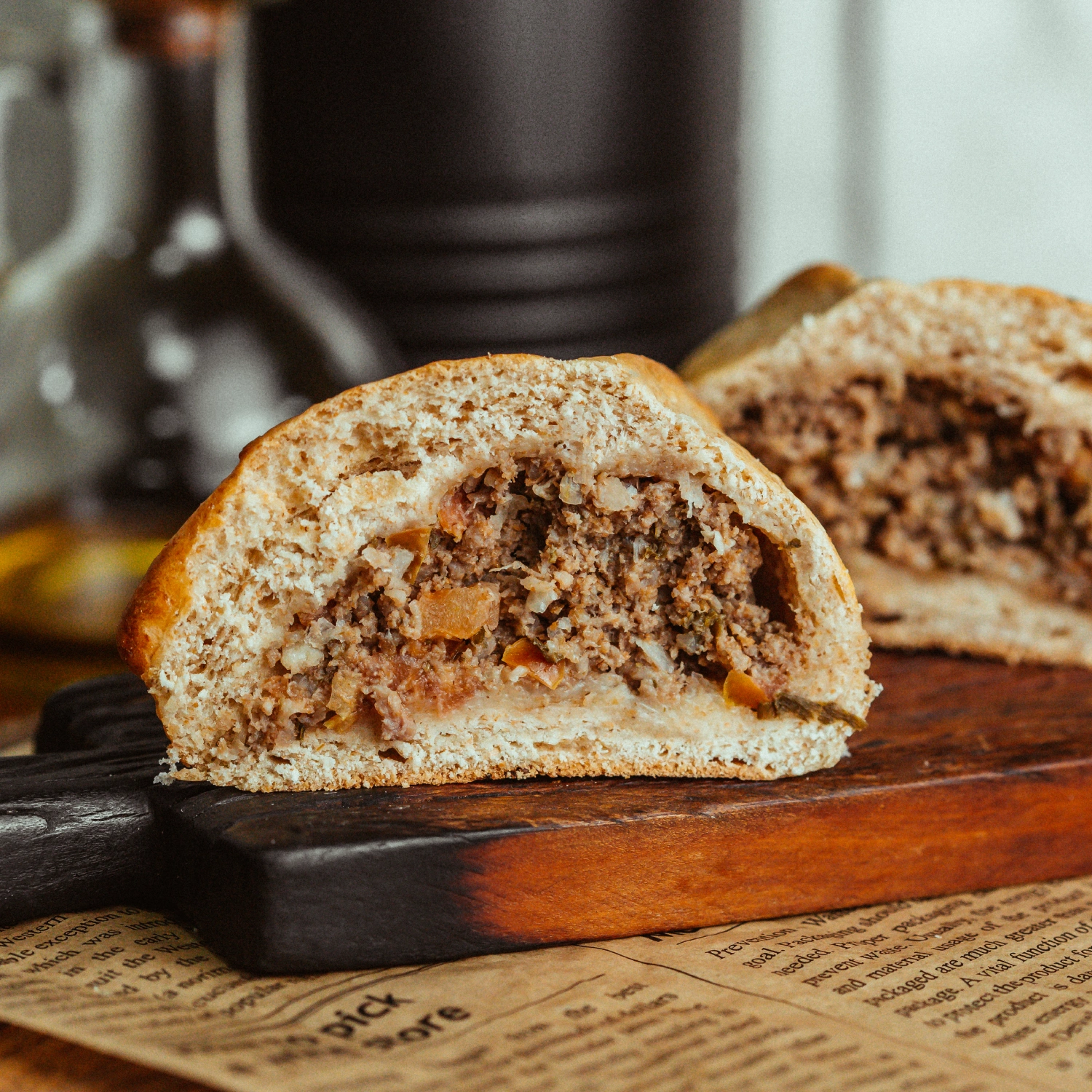 Ingredientes: Carne moída crua, farinha de trigo integral, água, leite integral, óleo de soja, açúcar, ovos, fermento biológico fresco, sal.