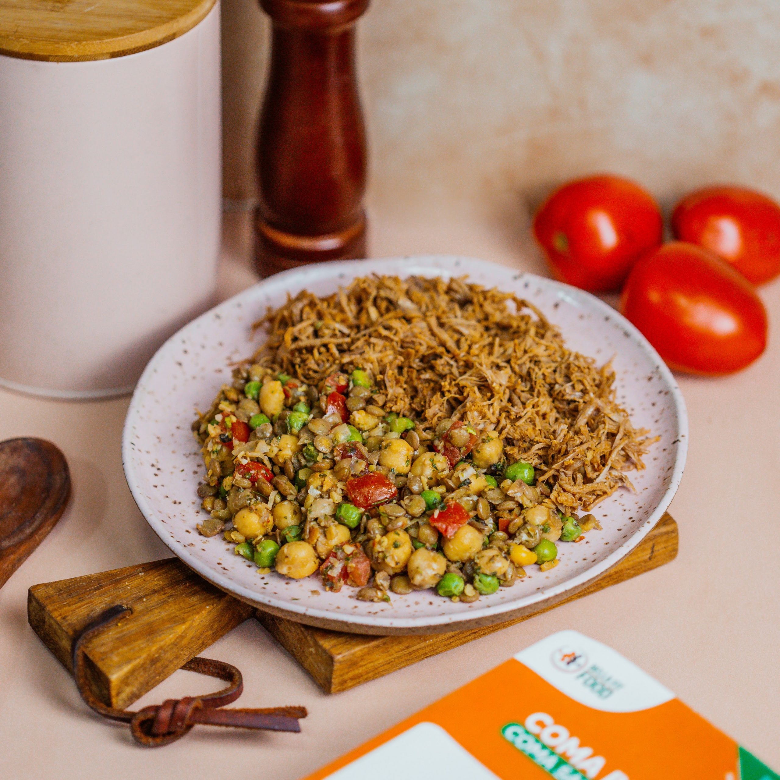 4 un. Carne lagarto desfiada com mix de grãos (grão-de-bico, lentilha, ervilha e tomate) 252kcal