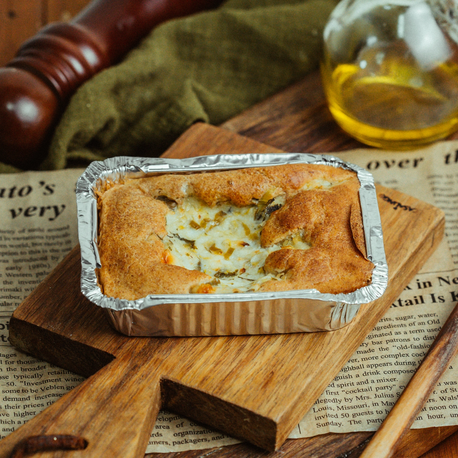 Alho-Poró com Queijo Branco: Uma opção leve e marcante, onde o sabor característico do alho-poró se combina com a suavidade do queijo branco. Uma torta que oferece uma experiência única de sabor e leveza. 124Kcal
