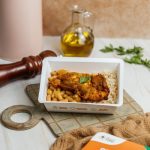 Ingredientes: Sobrecoxa, arroz integral, feijão carioca, maionese, mostarda, molho inglês, alho, páprica e açafrão.